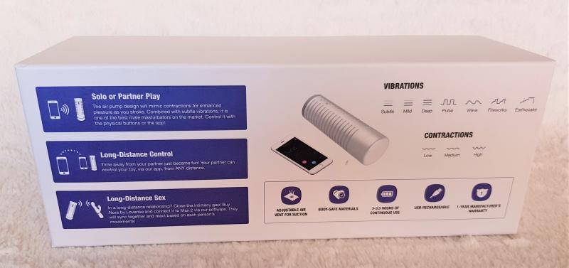 L’emballage n’est pas vraiment différent d’avant – juste plus grand pour accueillir un jouet légèrement plus grand. Désolé, j’ai perdu mon ancienne boîte Max il y a très longtemps, mais je suis sûr que vous trouverez en ligne des photos de l’ancien packaging (même si ce n’est pas le plus important). Il vous donne les informations de base (avant et arrière) sur l’essentiel afin que vous puissiez décider si vous souhaitez investir dans ce masturbateur.