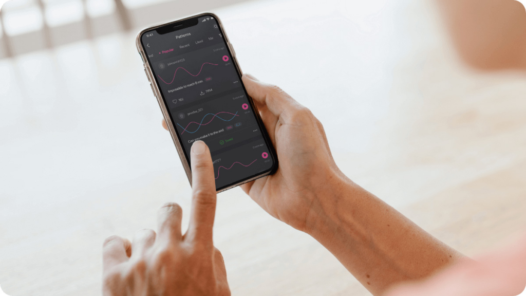 Dans l’application Lovense, il y a un partage de patterns. Des utilisateurs créent des séquences de vibrations et les partagent. Tu peux chercher par popularité, par durée, par type… C’est un peu comme des playlists Spotify, mais pour les vibrations.